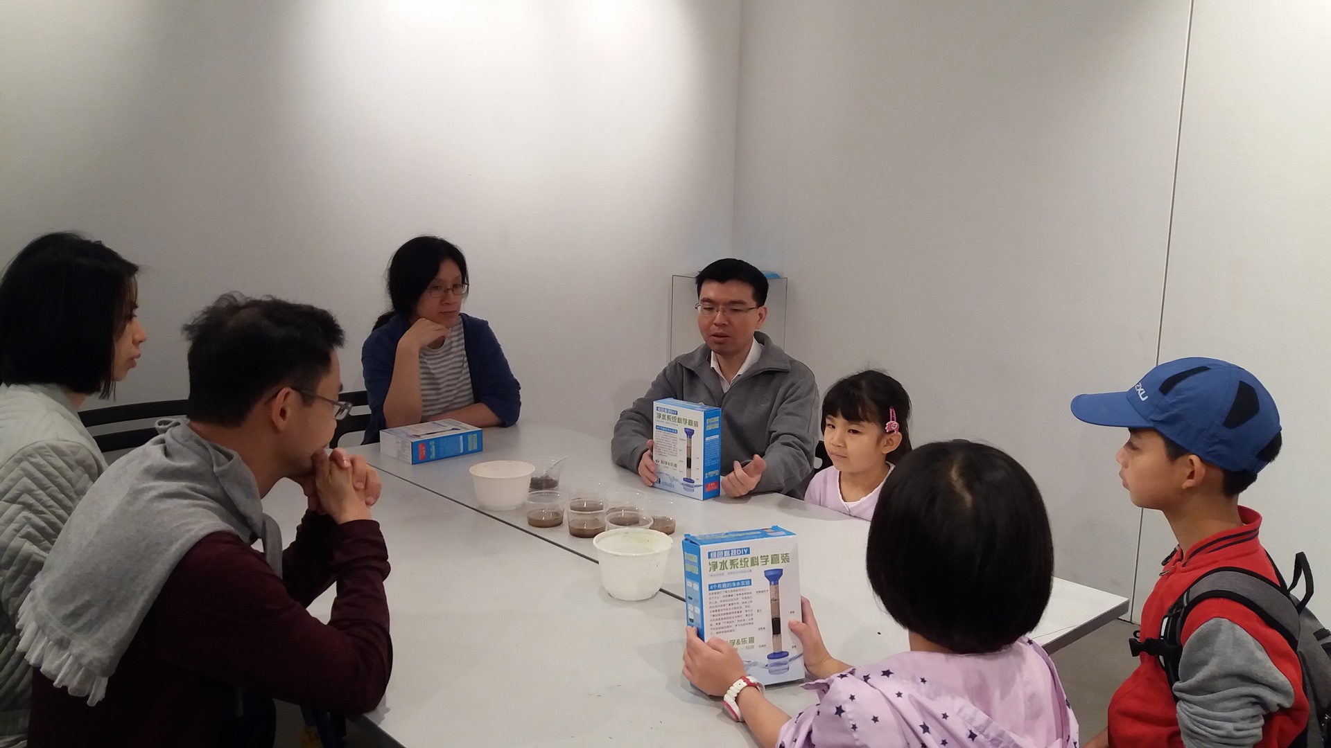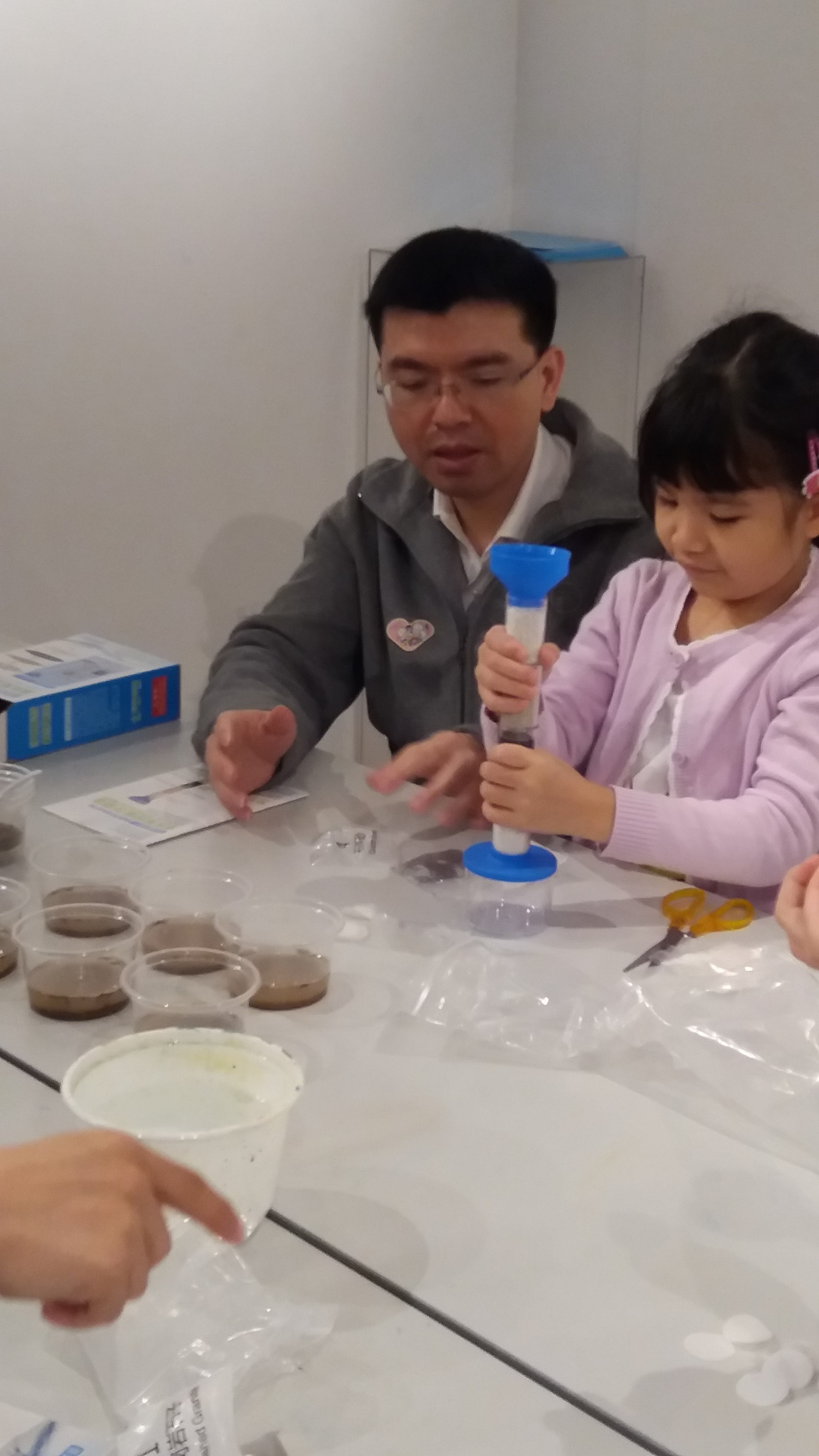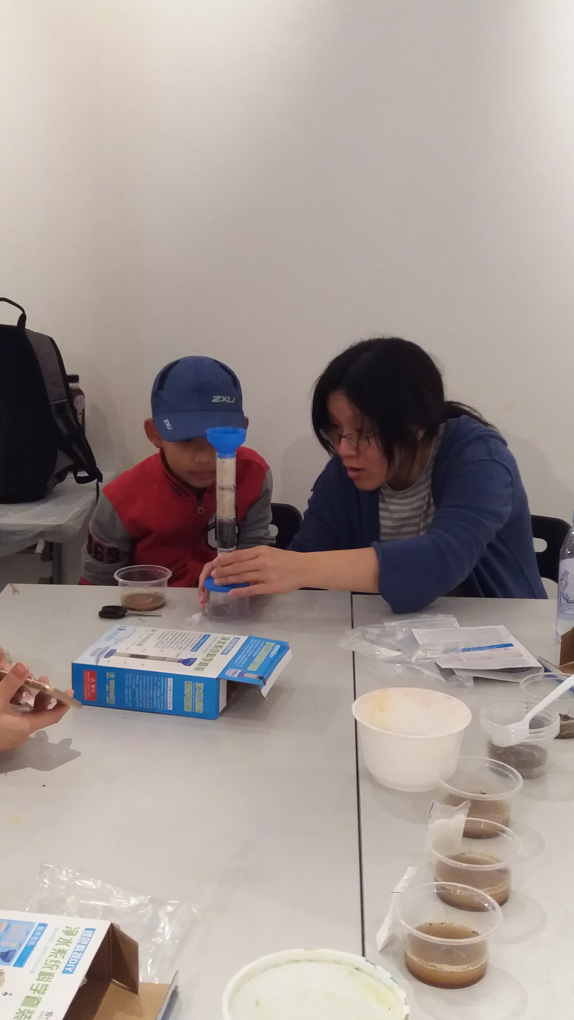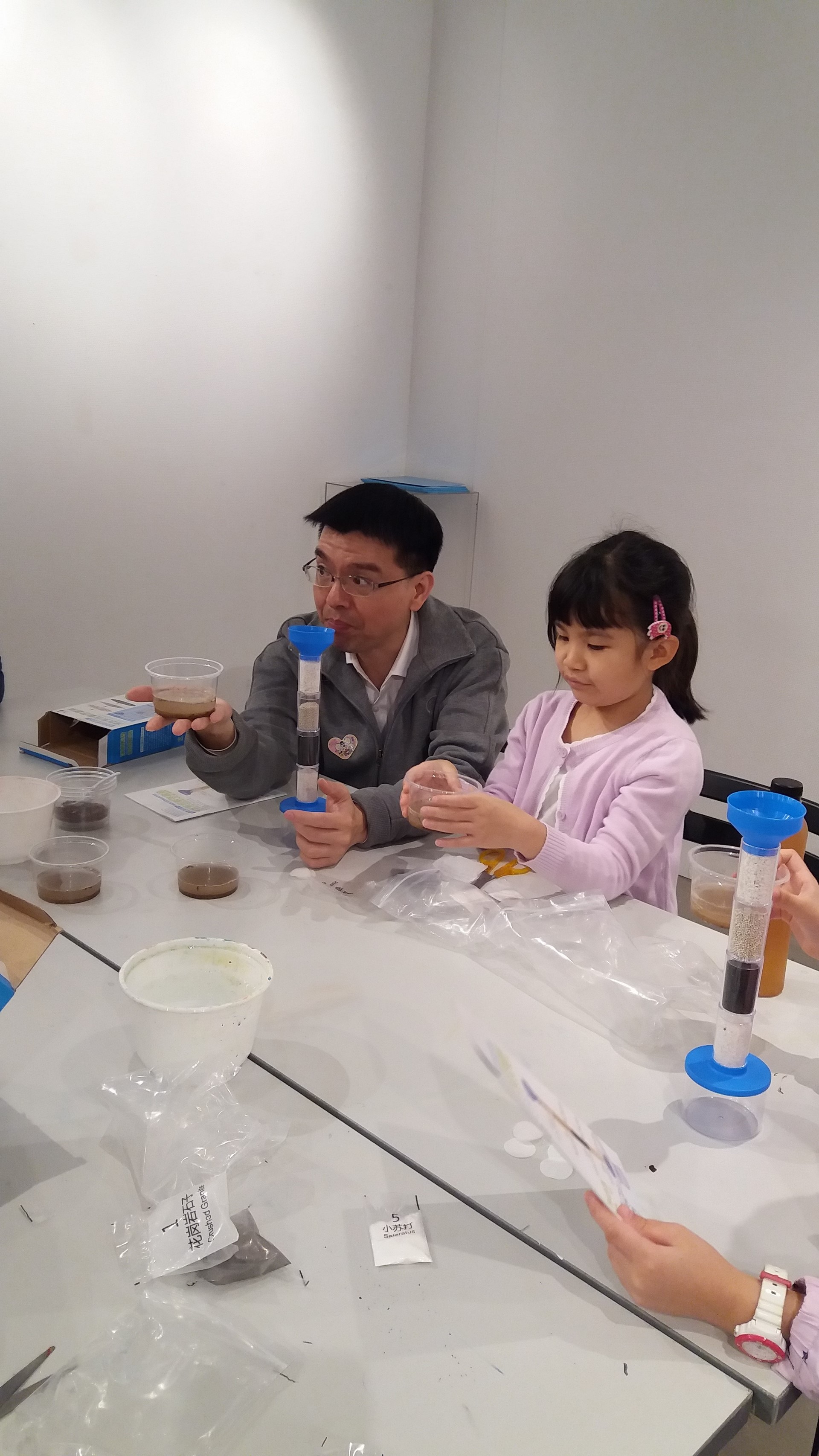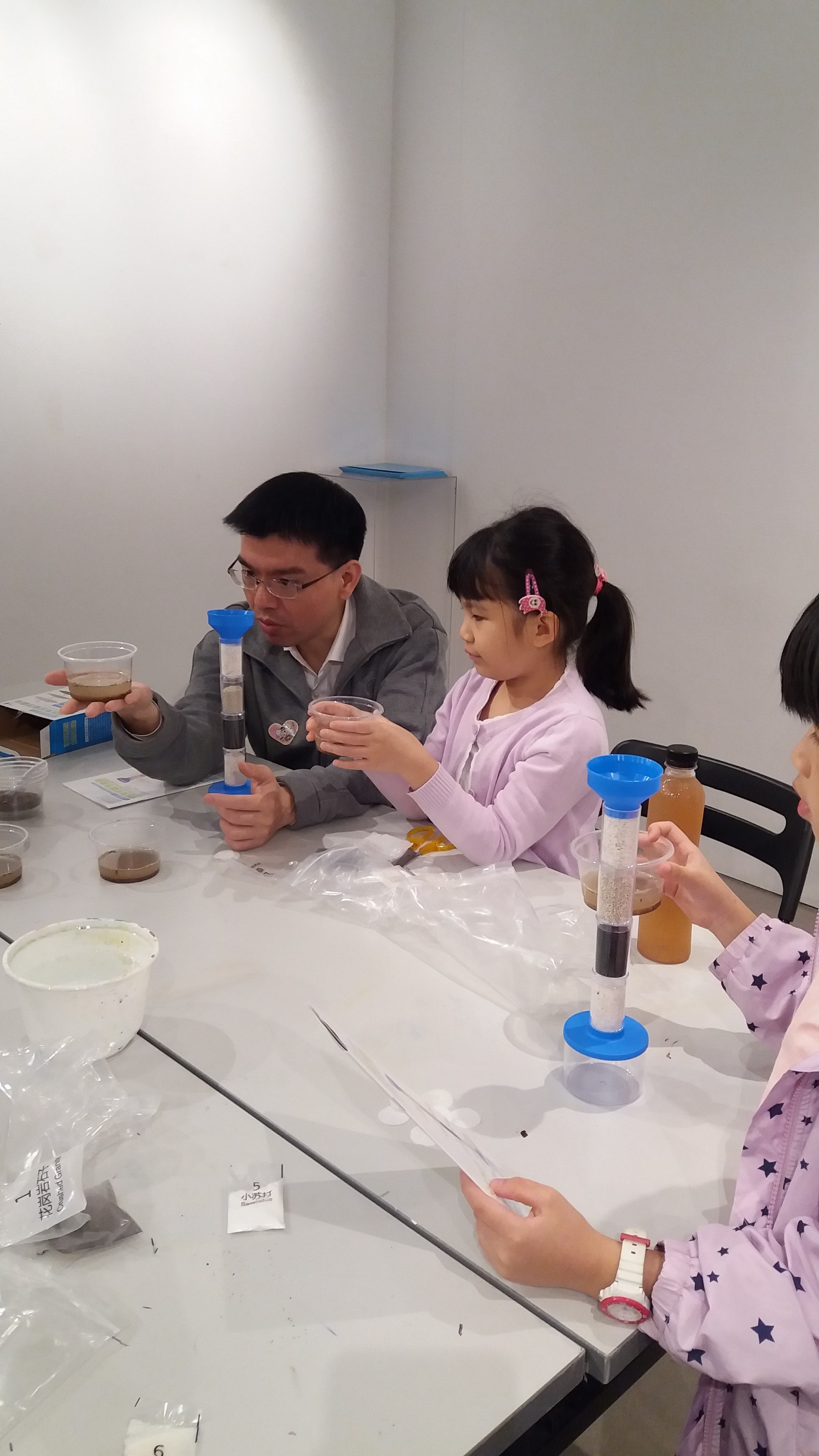 完成導賞後,參加者到達鯉魚門創意館參觀館內的石礦場圖片展覽,更在林sir的帶領下,齊齊動手做污水過濾的小實驗。參加小朋友都對於淨水設備的完成都興奮不已呢!
